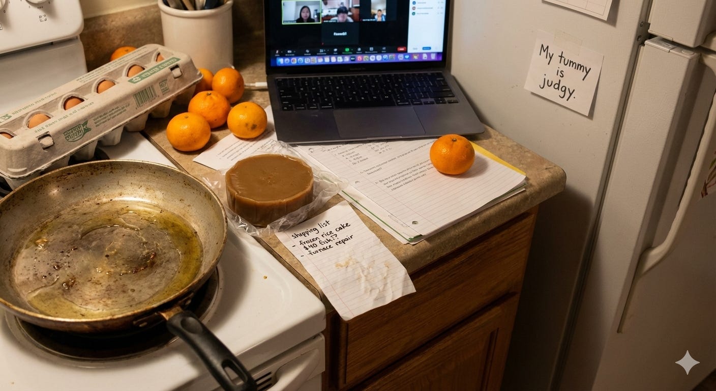 Then comes the guilt. Because the gap between fantasy and reality looks like this: it’s Monday night at nine. A frozen Canadian rice cake that costs too much and takes hours to thaw. A daughter announcing her tummy is “judgy.” The whole fish is forty dollars. We just paid for a furnace motor, a car repair, and an emergency root canal. Food prices have gone up. My work does not pause for a Chinese holiday—there are papers to grade, Zoom meetings, an endless stream of recommendation letters.